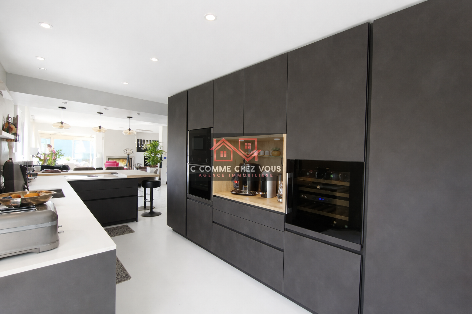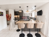 La cuisine ouverte, entièrement aménagée et équipée, a été conçue par un architecte pour allier esthétique et fonctionnalité.