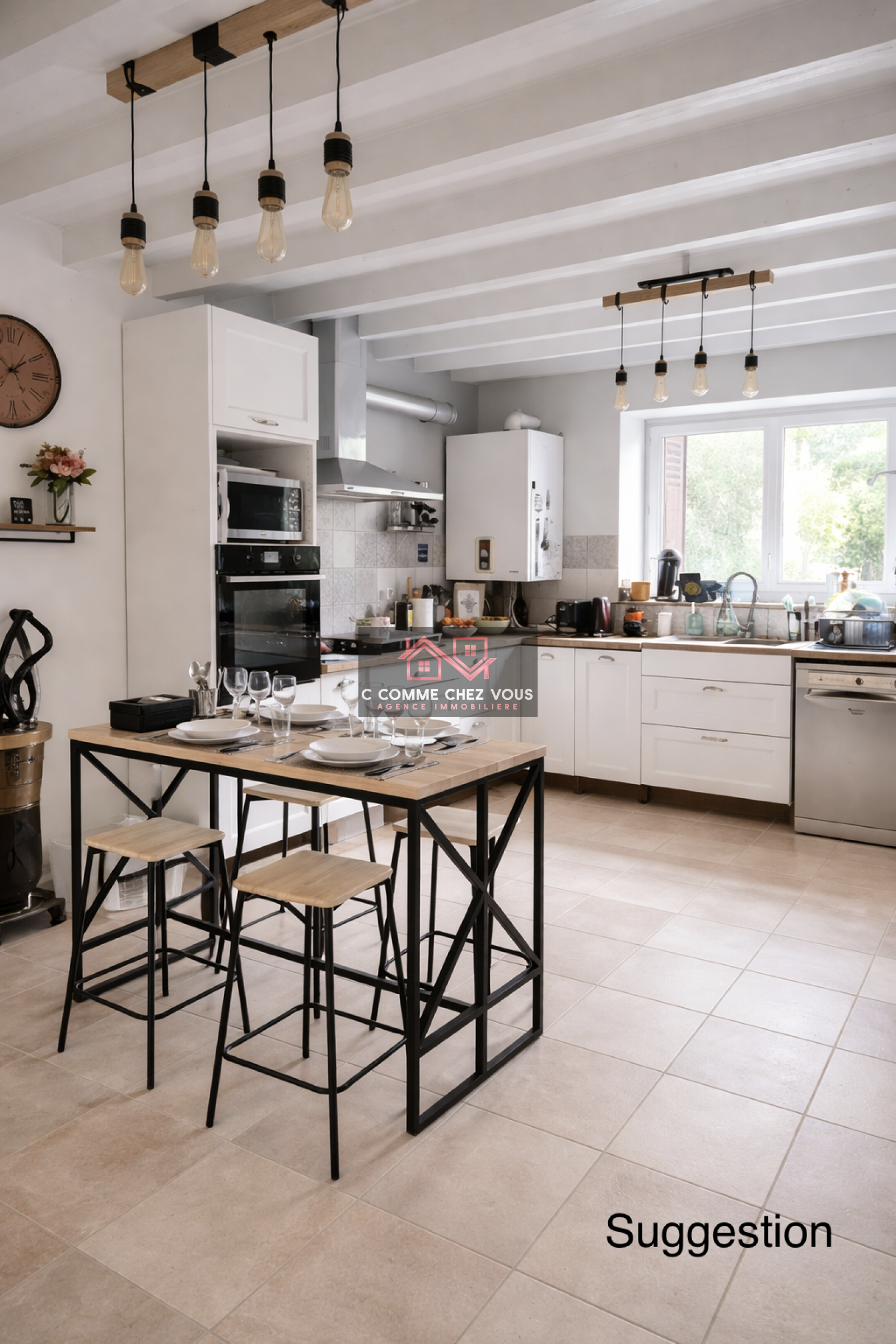 L'intérieur comprend une grande cuisine dinatoire avec poêle, un beau séjour avec pierres apparentes et cheminée idéal pour vos soirées d'hiver et toilettes au rez-de-chaussée